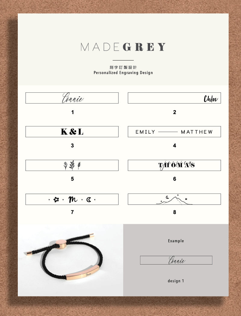 A modern two-tone design featuring an adjustable slider that glides along the rope for a perfect, flexible fitโ€”accommodating wrists up to 22 cm in circumference. Perfect bracelet for adding a personal touch with custom engraving. Choose from a variety of designs and fonts to create a unique and meaningful piece, whether itโ€™s a special date, a heartfelt message, or the name of a loved one.