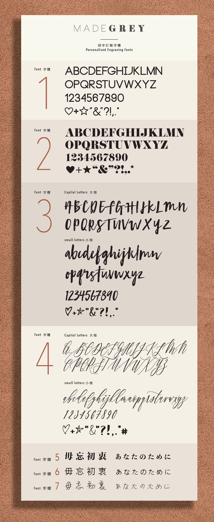 We use laser engraving, which allows for very detailed engraved characters and designs