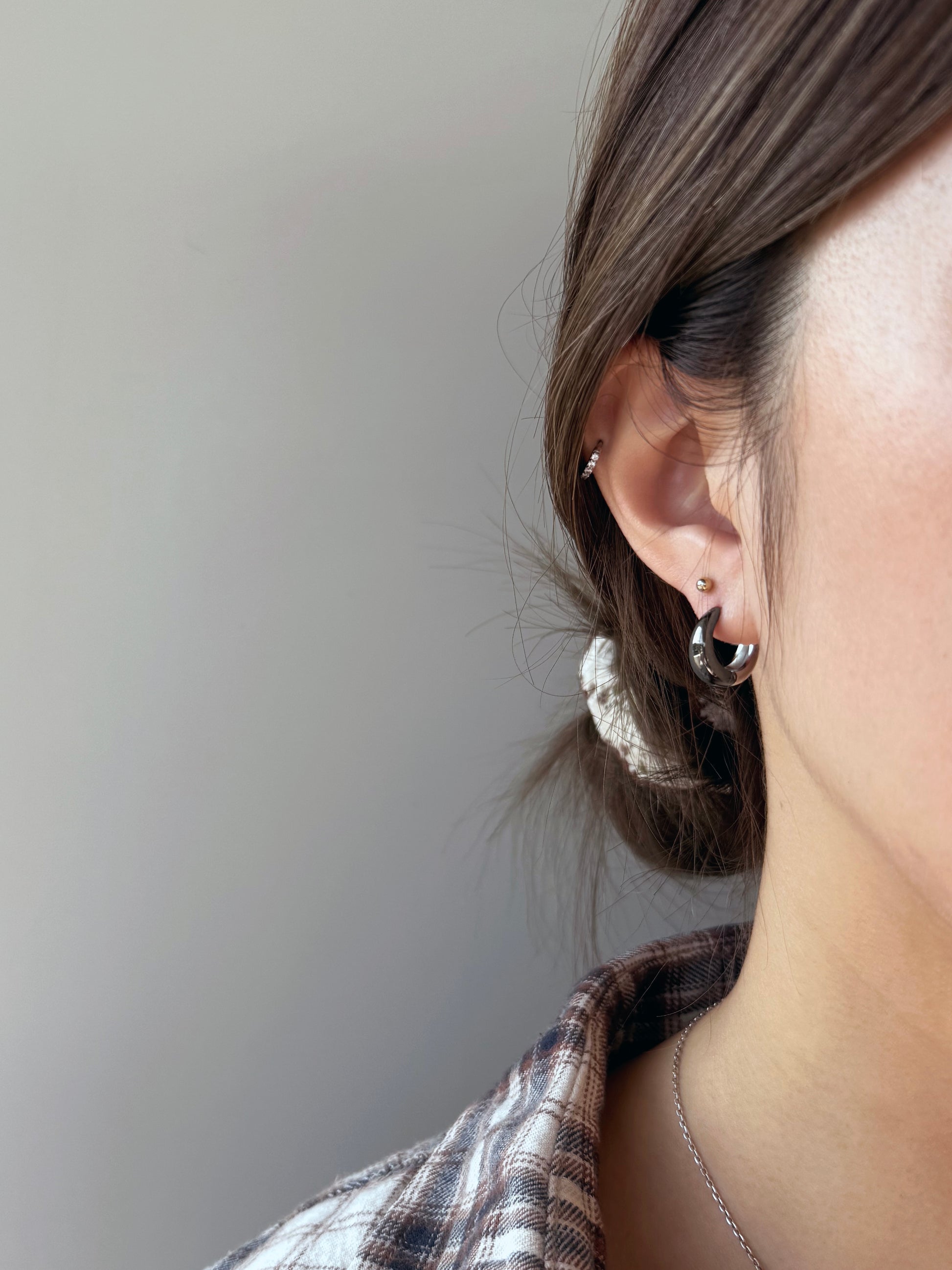 這款雙色耳環以時尚現代的設計,為經典珠寶提供別具一格的選擇。其多功能性讓你以兩種不同方式佩戴,輕鬆翻轉即可切換灰色與銀色,打造全新造型。採用低過敏不鏽鋼材質,確保全天舒適佩戴。
