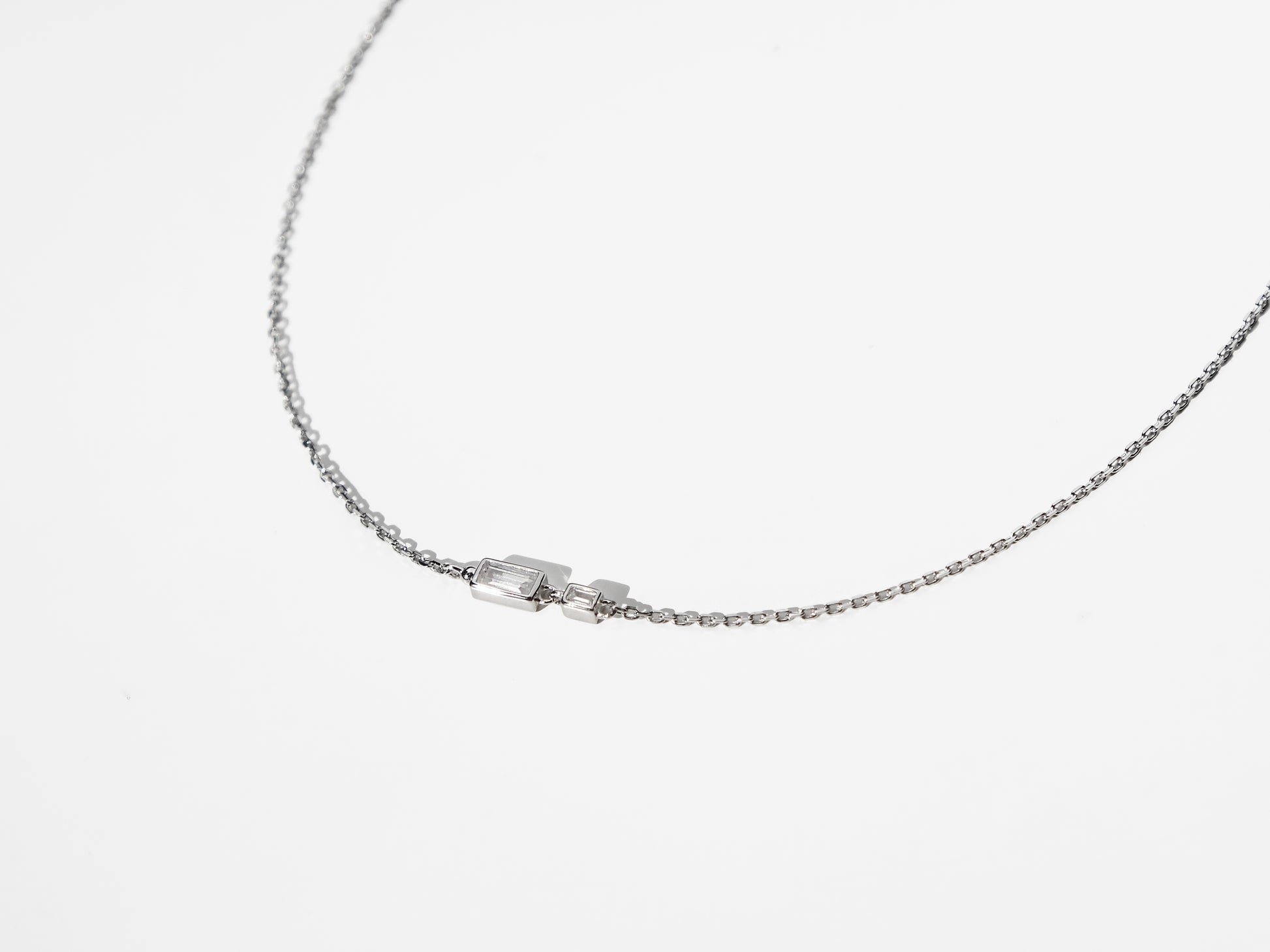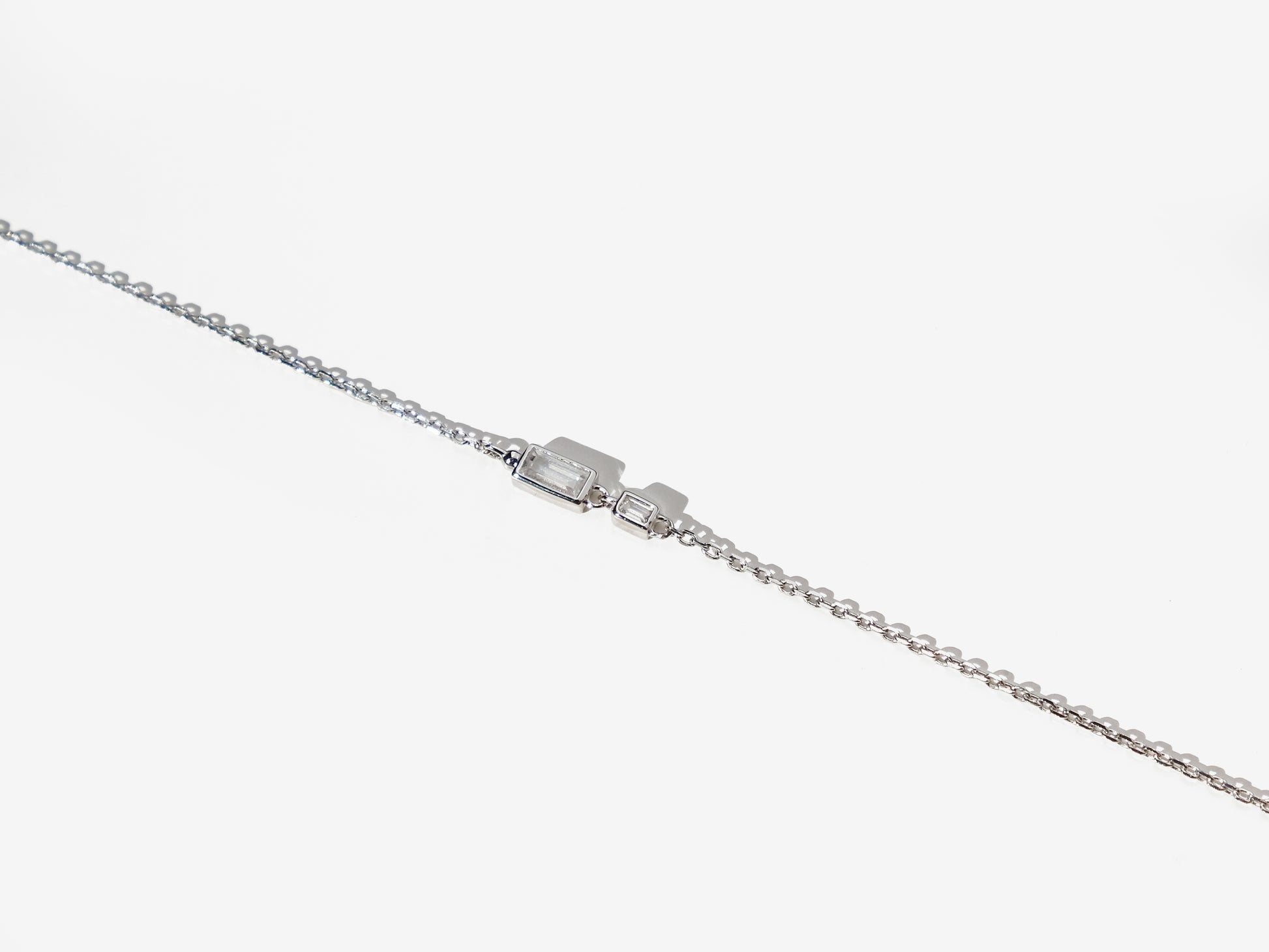 低調中帶有個性,展現現代簡約美感。這款手鍊以兩顆大小略有差異的長方形切割鋯石作點綴,營造出不對稱而時尚的設計細節,為日常造型增添獨特亮點。選用925純銀製作,搭配細緻鍊條,質感出眾。可調節長度設計,無論單戴或疊搭其他手鍊都同樣合適。