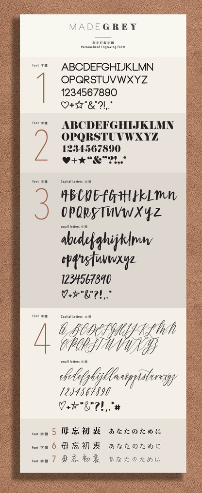刻字費用(如有)僅包括一位置。 我們可以在產品上刻兩個或以上位置,但請先聯絡我們確認加購
