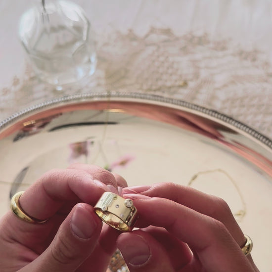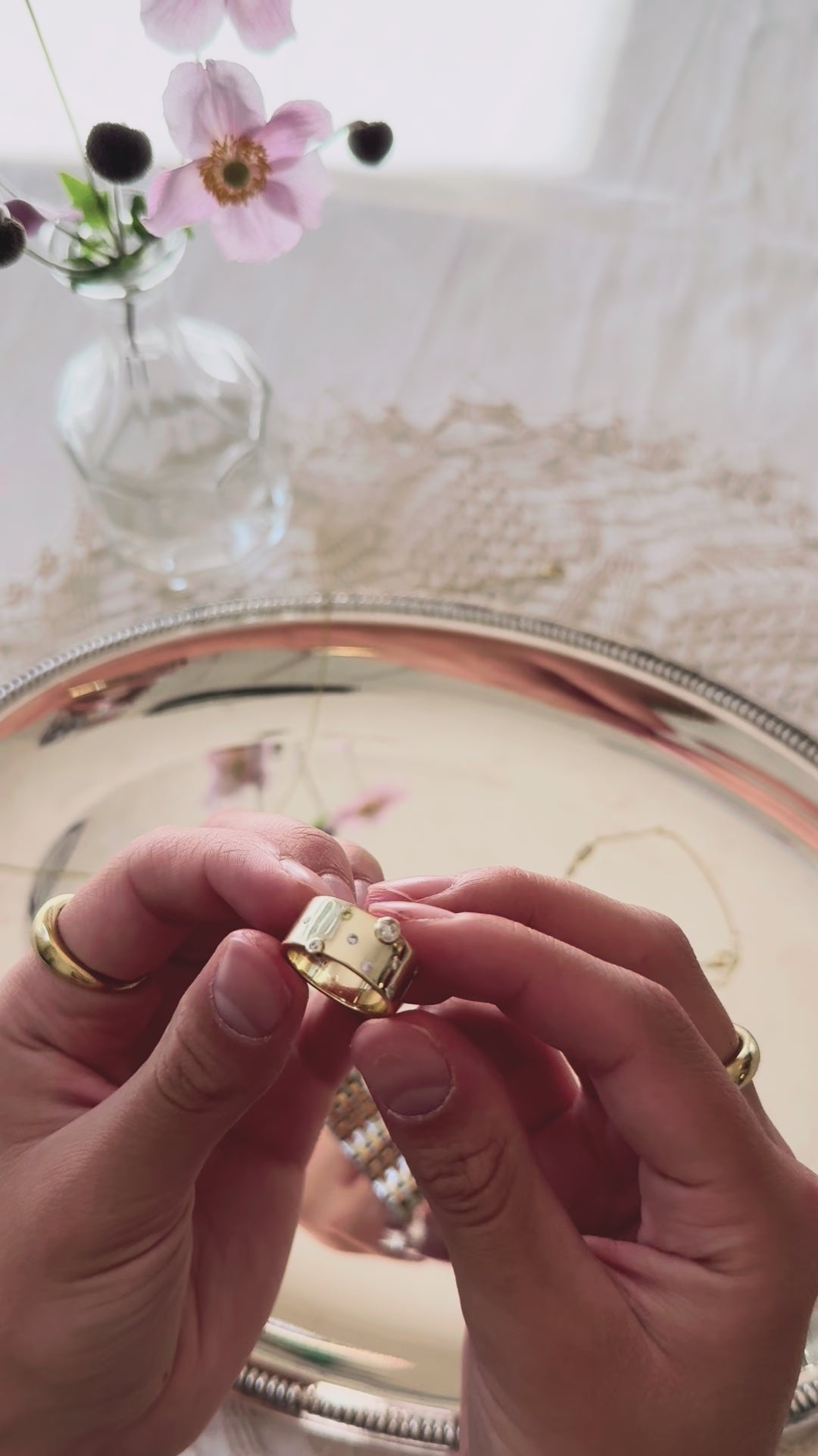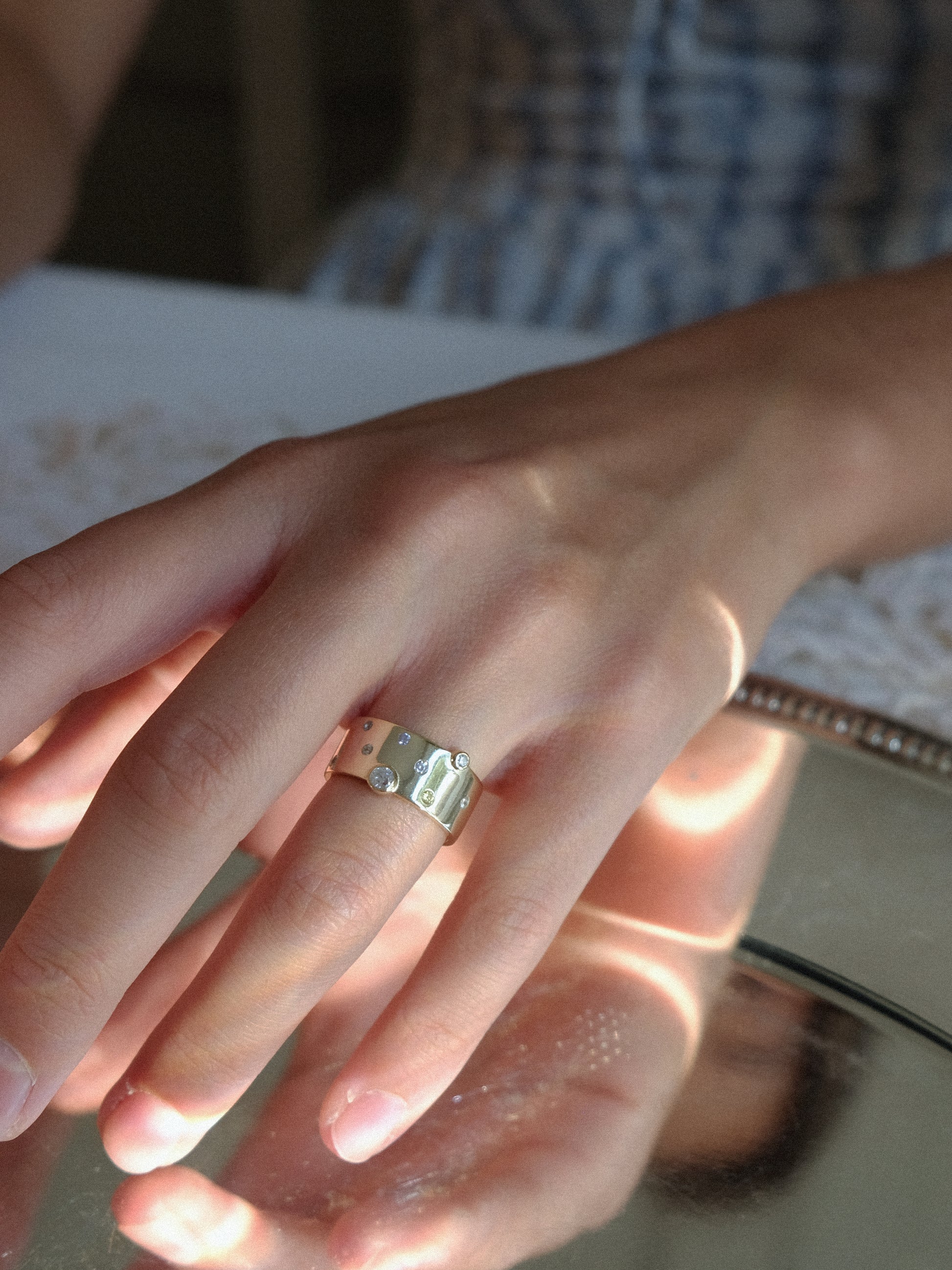 這款是我們較為搶眼的戒指之一。採用純銀打造,寬版戒身上點綴著大小不一的閃石,營造出自然且吸睛的光澤感。不對稱的排列設計為經典造型注入一點現代感,無論日常配戴還是特別場合,都能成為你的個性亮點。