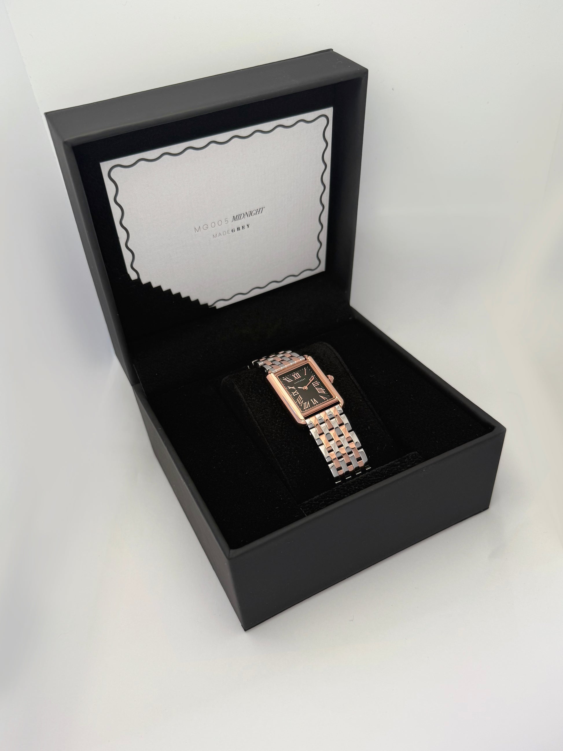 這款腕錶以深邃的午夜黑為靈感,錶面映照出夜色般的深黑色調。長方形錶殼帶出經典不敗的線條,而羅馬數字更增添一份永恆優雅。