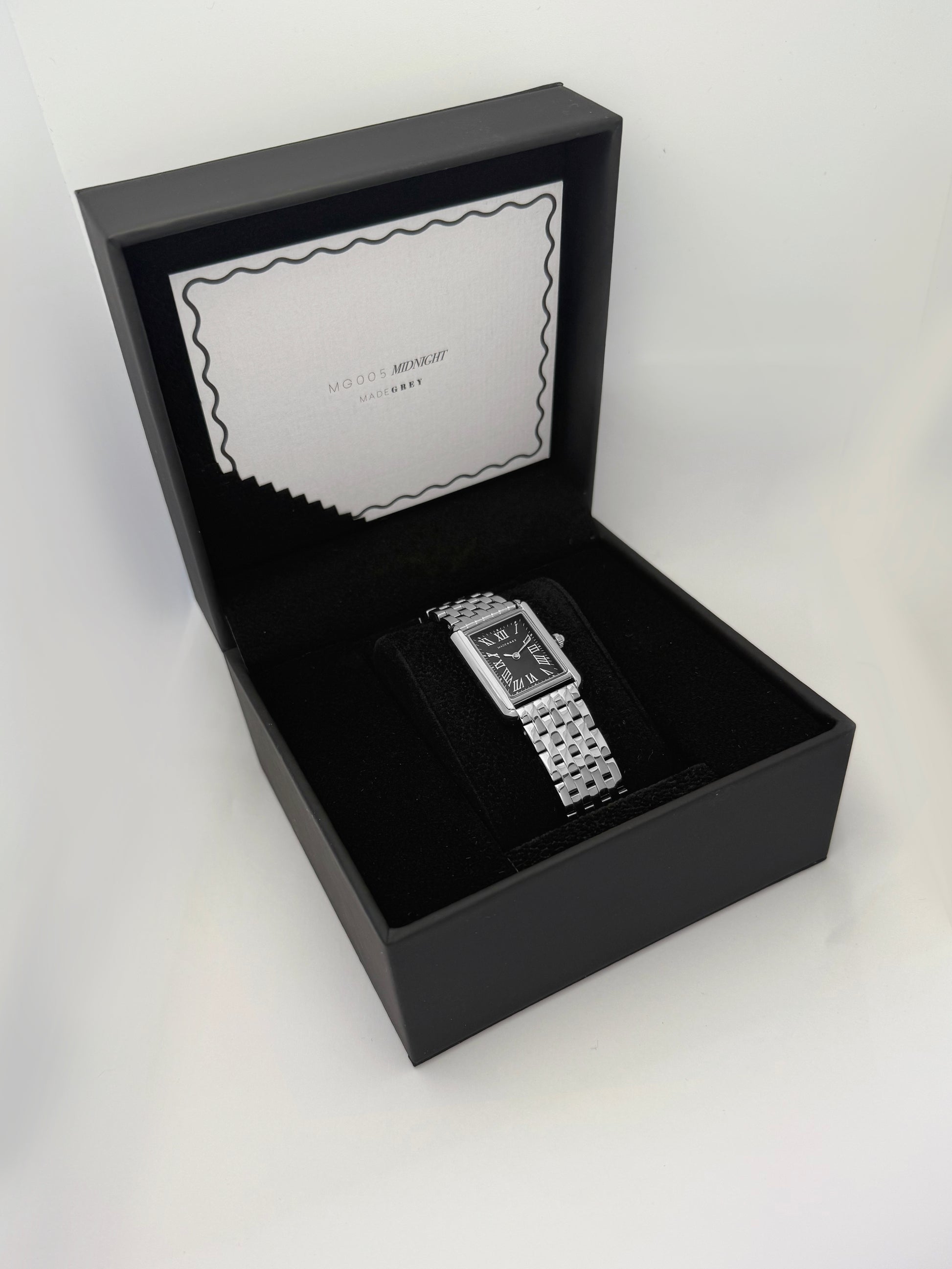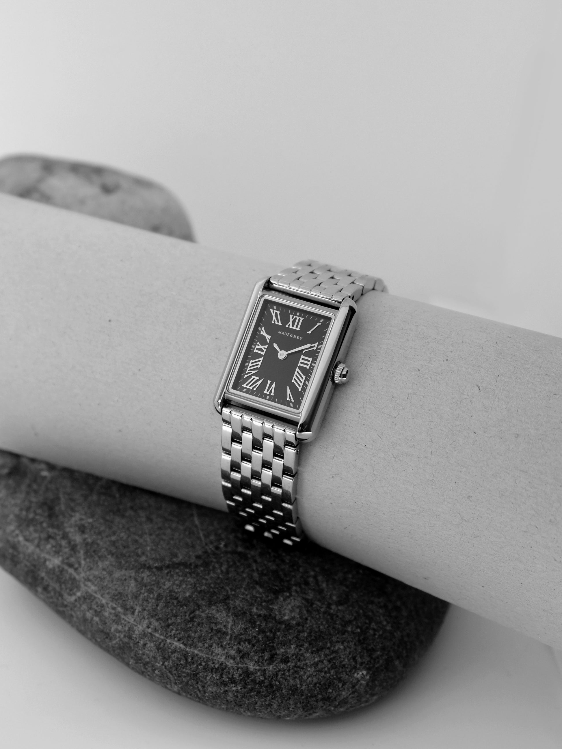 這款腕錶以深邃的午夜黑為靈感,錶面映照出夜色般的深黑色調。長方形錶殼帶出經典不敗的線條,而羅馬數字更增添一份永恆優雅。