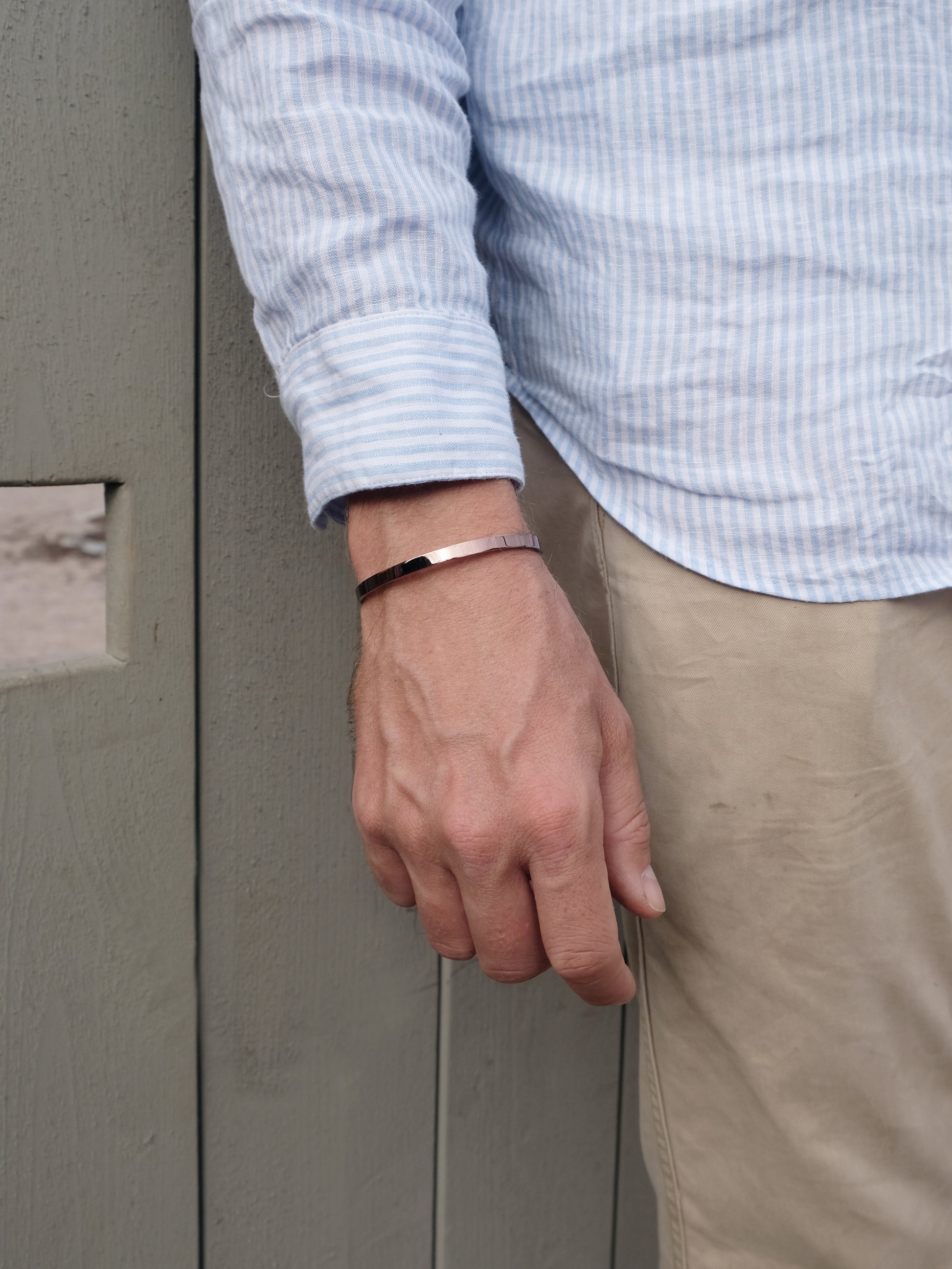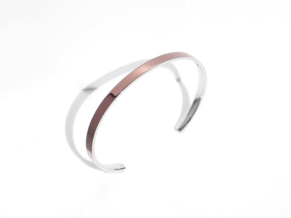 這款手環完美融合了冷調極簡風格與日常百搭設計。對比色調與高拋光質感,營造更具層次感的視覺效果。兼具美感與舒適度,採用平面外觀與圓潤內側設計,貼合手腕更舒適。選用不鏽鋼材質,確保耐用性、抗氧化性及低過敏特性。